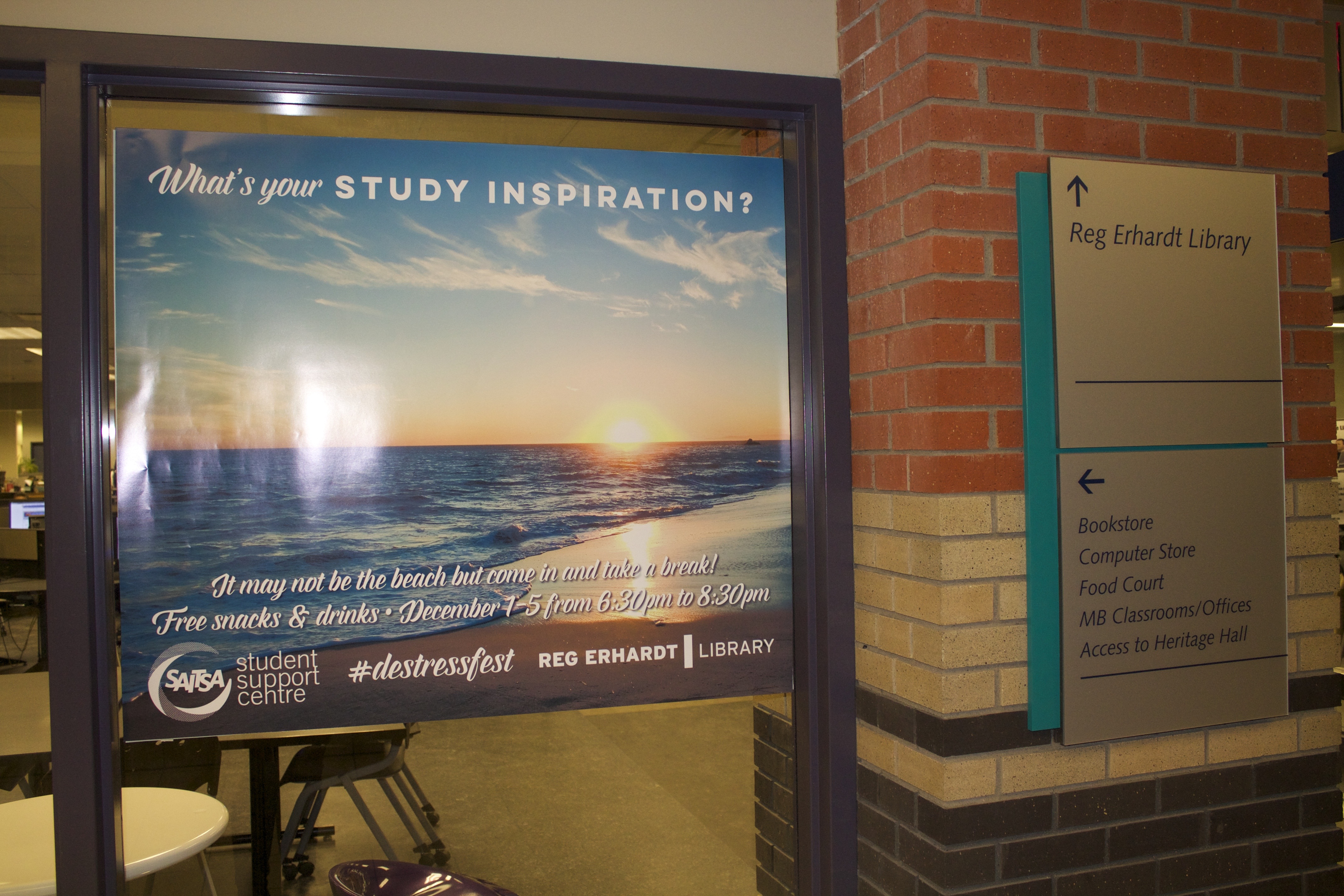 SAIT Polytechnic’s Student Association (SAITSA) puts a major emphasis on student well-being and mental health. SAITSA identifies critical times wherein students tend to experience stress and mental health issues and provides services and activities accordingly. For example, from October 6th -9th, SAITSA Mental Health Awareness Week included stand-up comedy, pet therapy, “Speed Friending”, information booths, massages, Zumba and Yoga. The Awareness Week coincided with Depression Screening Day, which was offered through Student Development and Counselling and the Calgary Counselling Centre, and SAITSA’s Mental Health Awareness Week was one way to encourage students to participate in the screening and access resources if needed. Most recently, SAITA’s De-Stress Fest (December 1st – December 5th) was a week filled with activities designed to reduce the stress of studying students, and proved to be an excellent opportunity to partner with the Reg Erhardt Library at SAIT.